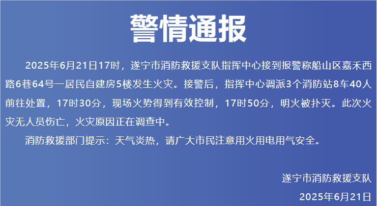 2025年6月21日17时,遂宁市消防救援支队指挥中心接到报警称船山区嘉禾西路6巷64号一居民自建房5楼发生火灾。接警后,指挥中心调派3个消防站8车40人前往处置,17时30分,现场火势得到有效控制,17时50分,明火被扑灭。此次火灾无人员伤亡,火灾原因正在调查中。